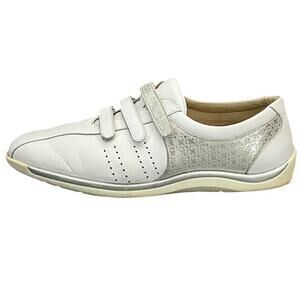 These stylish and comfortable sneakers are perfect for walking, running, or everyday wear! The white and silver leather upper is both durable and eye-catching. The slip-on design makes them easy to put on and take off.