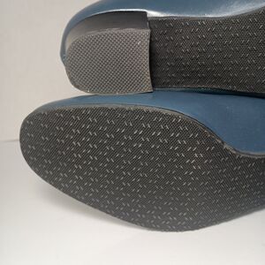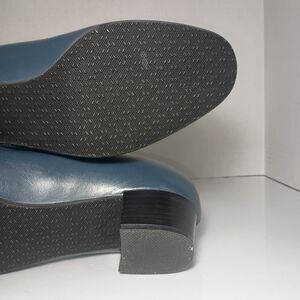 Classic and comfortable SAS Regina pumps in a beautiful blue leather, handcrafted in Italy. These womens size 8W (wide) heels feature a low, block heel and slipon design, perfect for work, church, events, or everyday dressy outfits. Made from genuine leather uppers with soft leather lining and a cushioned insole, they offer the signature SAS comfort and support in a timeless, minimalist silhouette. The interior length measures approximately 10 inches from toe to heel, consistent with a womens US 8 wide fit.