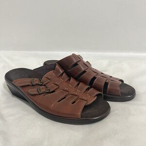 The SAS Sandals Women's 11 N in Red are a stylish and comfortable option for casual or travel occasions. Made with leather lining and upper material, these slip-on sandals feature a wedge heel and a solid pattern. The boho style of the sandals, with a hint of Native American and botanical themes, adds a unique touch to your outfit.