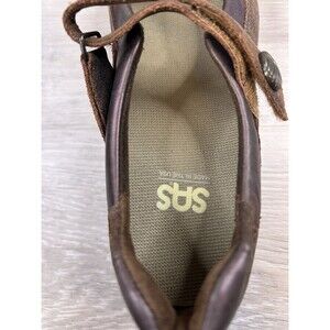 The SAS Step Out Women's Brown Mary Jane Shoes are designed for comfort and casual wear. These round-toe shoes feature a strap closure and a low heel, making them ideal for walking and everyday activities. Made of leather with a blended fabric lining, they offer a classic yet modern style in a solid brown color. The shoes have a mid-top shaft style and a synthetic outsole, perfect for summer, fall, and spring seasons. With the SAS brand known for quality, these Mary Janes provide a comfortable and stylish option for women in size 9.