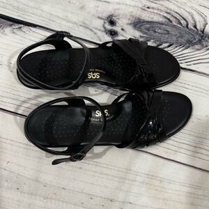 SAS Strippy Low Wedge Black Sandals Women's 9.5 M Tripad Leather Comfort Strappy