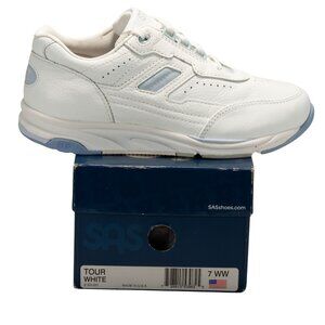 The SAS Tour Sneaker Women's Shoes in white, size 7 WW - Double Wide (D), are comfortable and breathable athletic shoes suitable for casual and activewear occasions. Made of leather with a rubber sole, these lace-up sneakers feature a low top design with a closed toe and are designed for walking activities. With a focus on comfort and style, these shoes are perfect for women looking for a durable and versatile option for their everyday footwear needs. Made in the United States by SAS, a reputable brand known for quality footwear, these sneakers are a reliable choice for women on the go.