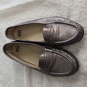 Experience unparalleled comfort and style with these SAS silver loafers, designed for everyday wear. The classic moccasin-style toe and penny keeper strap offer a timeless look, while the metallic finish adds a touch of elegance. Perfect for both casual and business casual settings, these flats are a versatile addition to any wardrobe.