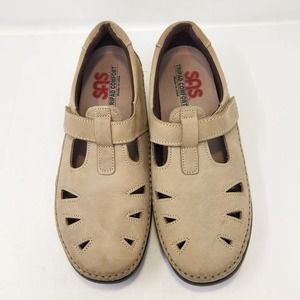 SAS women's Roamer tan beige leather slip on loafers, comfort walking shoes, adjustable hook and loop strap, cutouts, breathable, cushioned removable insole, closed round toe.