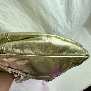 Generally this purse is in good vintage preowned condition. Has wear in different areas, including speckled areas on the leather. Color is a light gold/champagne tone.