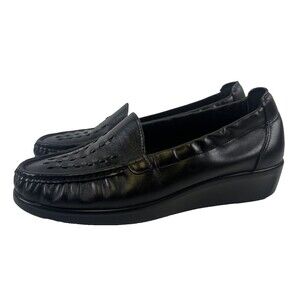 SAS Weave Slip On Loafer Black Leather Moc Toe Wedge Comfort Womens 8 W Wide