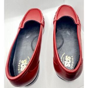 These are a pair of SAS Women's Size 7.5WW Tripad Comfort Shoes, a red slip-on loafer designed for ortho with a low heel height and arch support. The shoes are suitable for casual wear, travel, and workwear, featuring a comfortable and cushioned design with a rubber outsole for added durability. Made of leather and with a round toe shape, these shoes are crafted in the United States under the SAS Tripad product line, offering both style and comfort for everyday use. Excellent new condition.