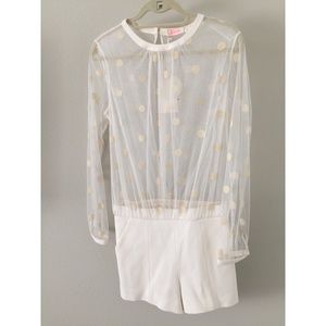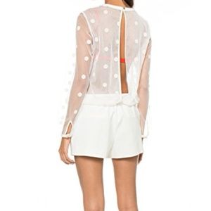 BNWT. Tonal velvet polka dots on sheer mesh bodice. A covered elastic panel lends a relaxed fit to the tailored suit shorts, and a button secures the extended back keyhole. Banded edges. 4-pocket styling. Sheer bodice. Lined shorts.