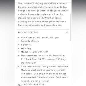 The Lumiere Wide Leg Jean offers a perfect blend of comfort and style with its wide-leg design and vintage wash. These jeans feature a classic five-pocket style and a front fly closure for a secure fit. Whether you're dressing up or down, these jeans provide a flattering silhouette and versatile wear.