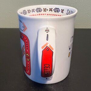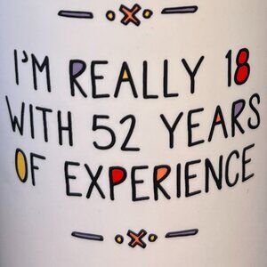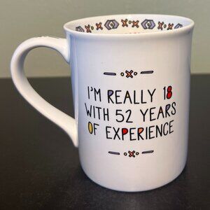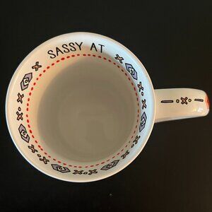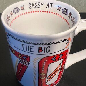 A whimsical celebratory birthday (or any occasion) porcelain mug for that special person in your life aged 70 or more. Interior and exterior features brightly colored artwork by Lorrie Veasey and reads: SASSY AT THE BIG 70. The other side reads, I”M REALLY 18 WITH 52 YEARS EXPERIENCE. The comfortable easy-to-grip handle features a red banner with decorative text that reads, CELEBRATE. Microwave and dishwasher safe. Measures 4.25" tall with a 3.5' diameter. Holds 14 fluid oz. From Our Name is Mud.