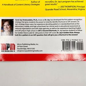 SAT 2 Second Shortcuts -is more about test taking strategies for standardized test success. "Dr. Jay has developed the first pattern-recognition strategy that gives students the power to instantly identify Shortcuts to SAT answers." There is writing in this book (quizzes, etc.) but the root information is valuable. Retail $22.99