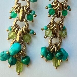 Carefully crafted in studios, this pair of fine gold-plated metal earrings for pierced ears is embellished with clusters of turquoise and green crystals. Just like a precious mobile, this Annella jewelry will enhance you look by adding movement and lightness. Aprox 3"