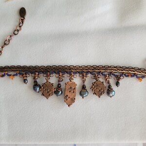 MSRP 144.00..This exquisite Satellite Paris vintage amethyst faceted glass stone bracelet features intricate details on a wider style fancy copper metal chain The piece includes fancy amethyst rectangular and red oval prong set faceted stones along with freshwater pearls,glass beads and crystals.The chain has embellishments that include tiny amethyst beads looped below as well intermittently spaced brightly colored mini flowers.The beautiful faceted glass stones charms are hung from miniature metal bows attached to the loops. With a unique design and vintage appeal, this bracelet is perfect for any occasion and is a one-of-a-kind fashion statement for women. Made in France by Satellite Paris and imported by me for my jewelry business, this original piece exudes true elegance as well as much charm.Measures approximately 8" long including the 2" extender chain.