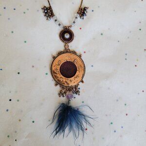 This Satellite Paris Necklace is new,never worn from an earlier vintage collection that has been stored.It features a good size round copper pendant with raised pattern on the front and the back looks somewhat hammered and wavy.The burgandy center is what manufacturer listed as leather so there is some very slight variation in the color..looks a tiny hair darker in small area because leather is a natural material.There is a smaller leathered component with small center stone(looks to be the blue lace agate) attached at the top and both have been embellished by freshwater pearls,along with what the manufacturer listed as used in this collection as blue lace agate,iolite and or amethyst beadsThese beads look like the agate(beads along the top) and the amethyst(bottom faceted bead) to meThe pendant has a beautiful blue feather hanging at the very bottom making this for a most unique and interesting piece.The coppery chain is fluid-like, resembling a snake chain. The necklace is handmade in France by the brand Satellite Paris and measures approximately 17" long including the approximate 2" extender chain. No tag.Matching bracelet available