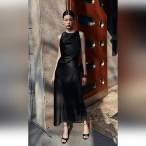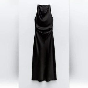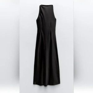 Dress with wide round neckline and twisted armscyes. Tailored waist with side gathers.