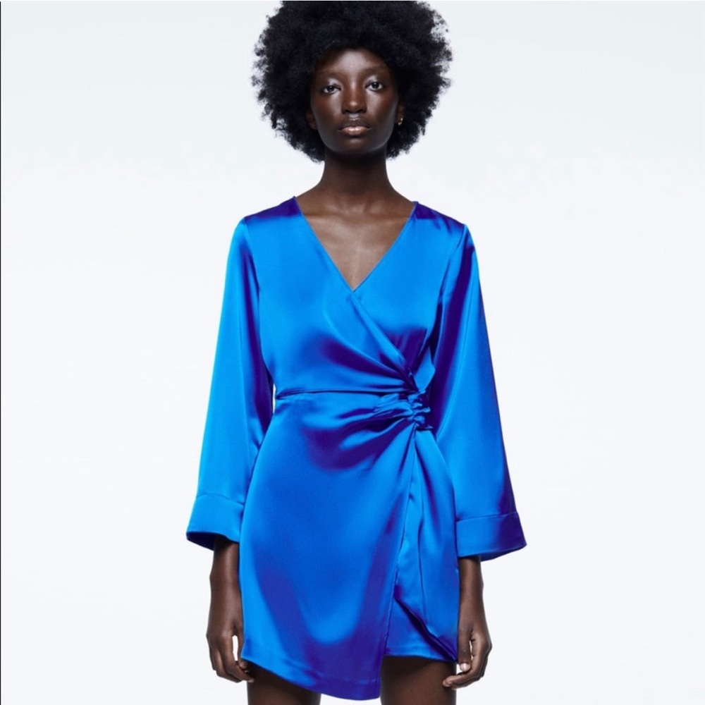 Short dress with surplice V-neckline and wide long sleeves. Front knot. Back hidden in-seam zip closure.