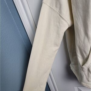 Cream colored anthro zip up jacket with colorful hood strings. There are signs of pilling as well as a few marks as shown in pictures. Please make sure to look through them all! Size Small
