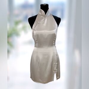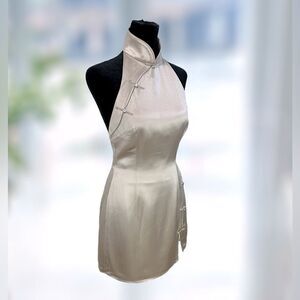 Mae is a cheongsam-inspired satin mini dress with lustrous crystal buttons, a halter neck and dramatic full backless silhouette. Its modernized Eastern-inspired design promises a night of mesmerizing allure at celebratory soirées.
