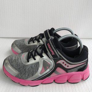 Stylish Saucony sneakers for kids. Features silver and pink accents. Comfortable and durable design.