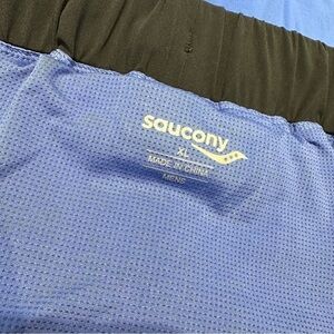 SAUCONY MEN'S OUTPACE 5" SHORT (SET OF 2) in a Black & Blue lightweight Polyester/Spandex blend with reflective logos and 5" inseam. Features a Y-fold elastic waistband with interior drawcord, hem vent finished with bartack, one zippered pocket at center back, and inner liner material is soft and supportive. Size XL. Worn once or twice, laundered and in excellent condition.