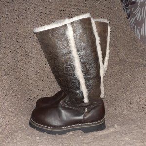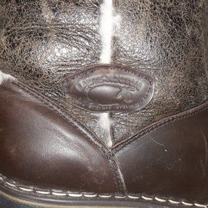 The brown leather exterior with distressed finish and cream sheepskin accents offer a stylish and cozy look, paired with a mid-calf shaft style and round toe shape.