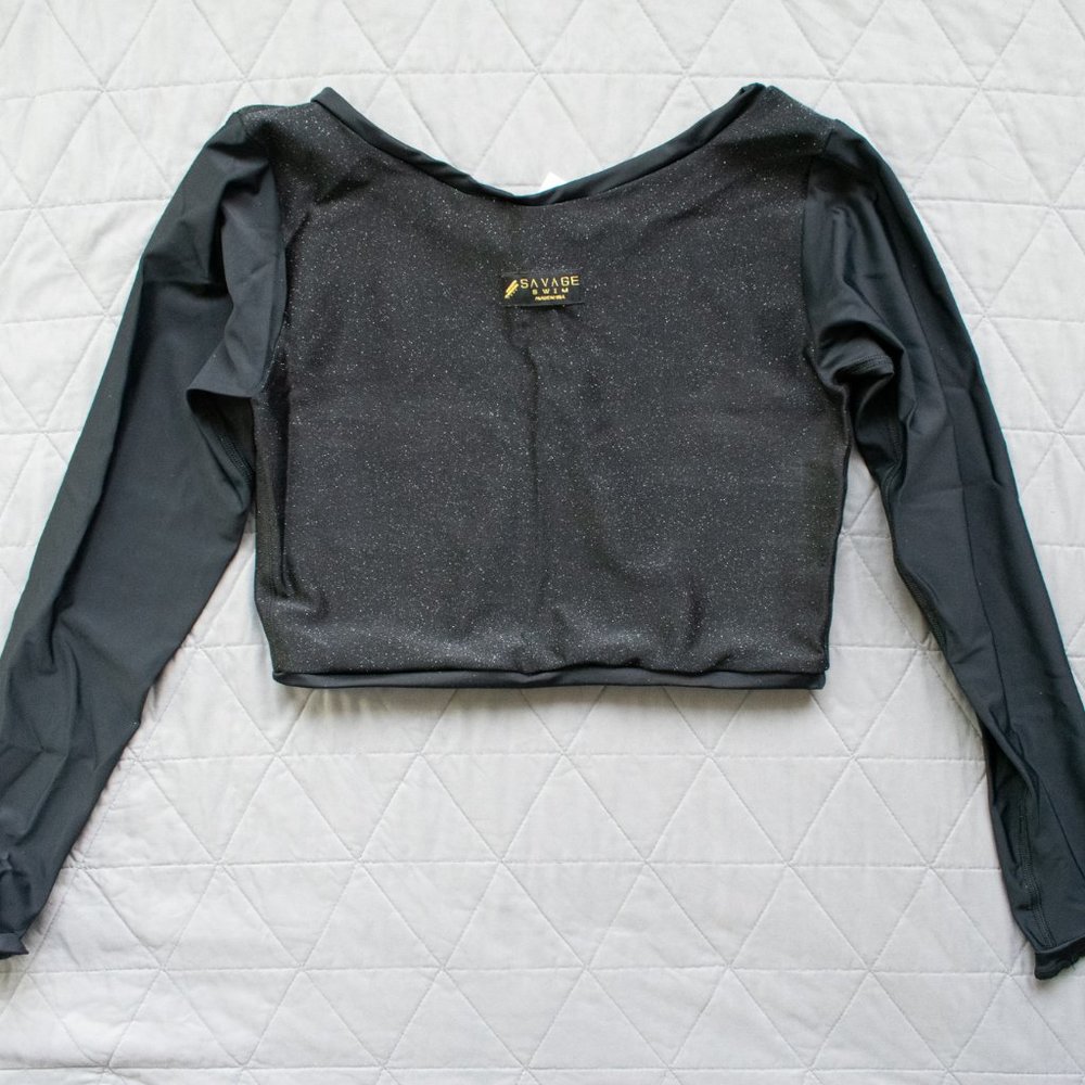 BRAND NEW! Custom Savage Swim rash guard. Reversible, black with black sparkles. Paid over $100 new!