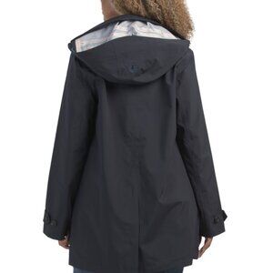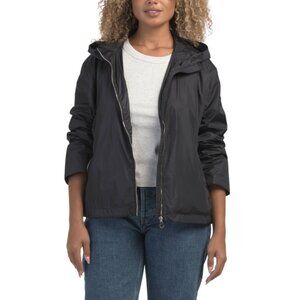2 front pockets, water and wind resistant, elastic cuffs, drawcord hem, packable into included pouch