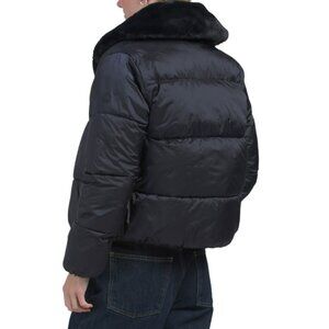 quilted design, puffer style, 2 front zip pockets, faux fur collar, elastic cuffs