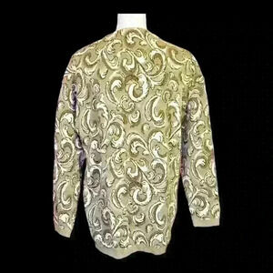 SAVILLE - RENA ROWAN Woman's SAGE GREEN w/IVORY Print Cardigan Tunic Sweater Sm