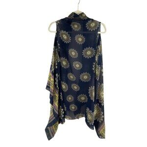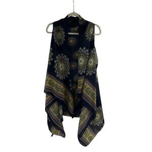 SAX Womens Sheer Vest Mandala Print Navy Blue Yellow Acrylic Open Front Bohemian