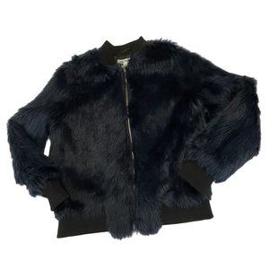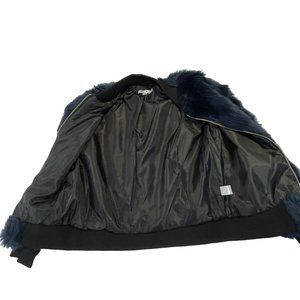 SAY WHAT? Faux Fur Jacket Coat Size Small Midnight Blue with Black Trim.