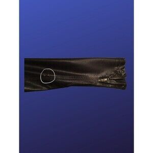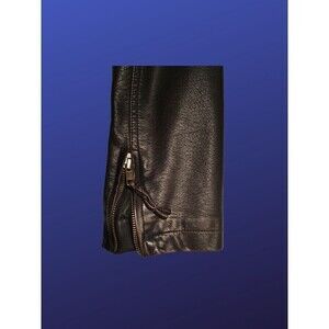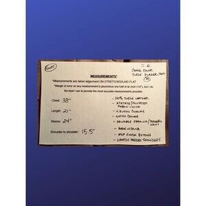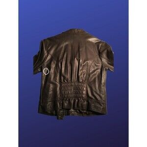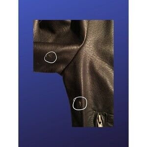 Style# 42073; 60% Polyurethane, 40% cotton; 100% Polyester Lining; cross zip fastening; "1/2" epaulettes; princess seaming; elasticized/flocked rear waist; zip cuffs; hanging loop; 2 front zipped slash pockets; brass-tone zips/snaps; zipper/snap closures; fringed zipper pulls; made in China. There are some small areas of peeling at left armpit/side, and on the back of the right sleeve (see last 3 pics; I'd still wear it).