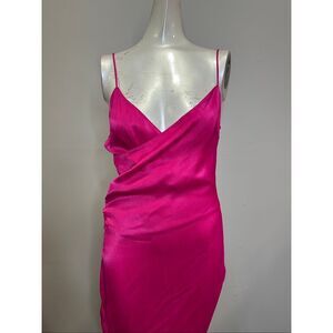 Cut in a gathered faux-wrap silhouette, Saylor's sleeveless satin Ayn midi-dress boasts a thigh-high side slit and tonal feather hem.