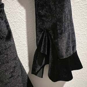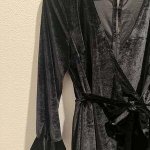 Luxurious SAYLOR Black Velvet Belted Romper, Size L — perfect for a sophisticated seasonal look. This romper features a deep V-neck, long sleeves with ruffled cuffs, and a flattering self-tie belt to cinch the waist. The rich black velvet fabric ensures a chic and elegant appearance, ideal for cocktail parties, evening events, or a night out.