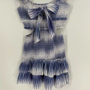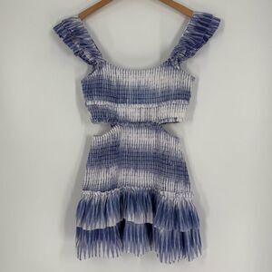 The Carlynn Smocked Cutout Dress by Saylor in White and Blue stripe. From the Ikat Collection. The Carlynn minidress from Saylor flaunts a smocked construction, cut outs at the waist, and a ruffled skirt and straps. Square neck. Ruffle straps. Bow at back. Gently worn with no flaws.