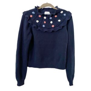 Navy blue sweater with floral collar. Ruffled overlay detail. Cozy 100% polyester. Great preloved condition! Size medium