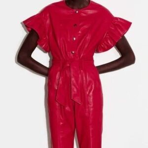 This fitted vegan leather jumpsuit is coming in hot. Packed with details: ruffle sleeves, button front, belt loops, and a matching tie belt- it's the coolest one piece. Pair with platforms for a night out or keep it casual with sneakers, there's no wrong choice.