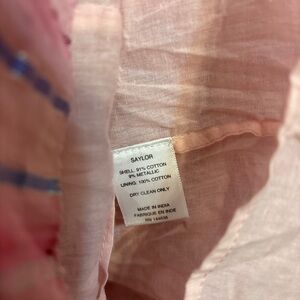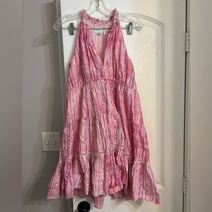 Tiered sleeveless mini dress in a metallic stripe has a "v" neckline and collar band