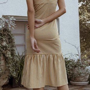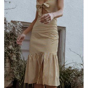 SAYLOR Sundress Stripes Knit Cutout Tie Front. Mustard Yellow & White. V Front & Back. Peplum Ruffle Hem. Spaghetti Strips. Cotton plus 5% Spandex for Hugging Stretch. Sheath. Sleeveless. Front Thigh Slit. Dry Clean. Tagged Size M.