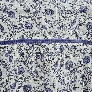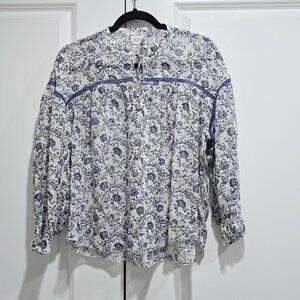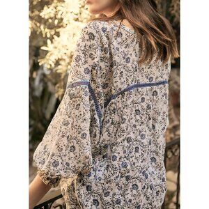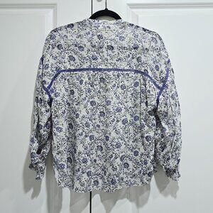 The billowy sleeved blouse in a dusty blue floral print with a "v" neckline and embroidered trim can be paired easily with jeans.