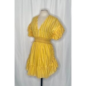 SAYLOR Yellow Metallic Striped Dress Fluttery Smocked Mini Gold Party Medium