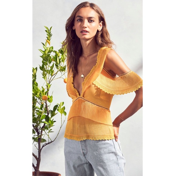 Vibrant yellow blouse with ruffled details. Off-shoulder design. Perfect for summer.