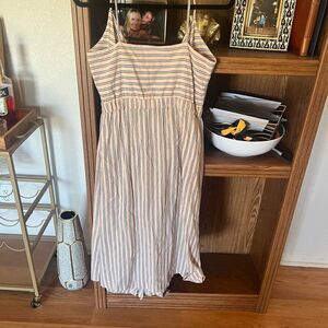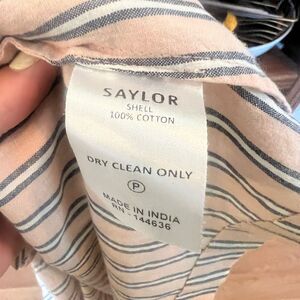 Saylor x Revolve Wrap front midi dress in blush cotton stripe shirting. Pockets at side seams. • Self: 100% Cotton • Unlined • excellent condition.
