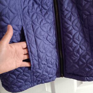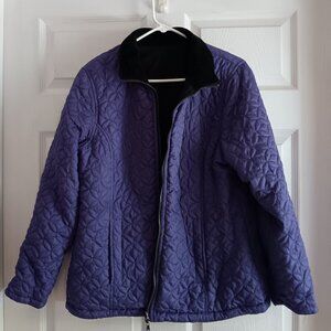 Very nice jacket / coat. Reversible, pockets on both sides. Purple side has a quilted pattern, Black side is smooth with purple and white piping. Poly-fill. In very good condition.