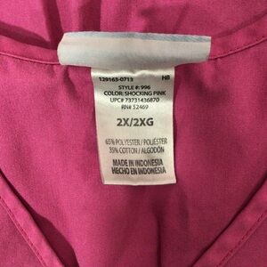 SB Scrubs pink scrub top. Size 2X. Made of a polyester/cotton blend. Machine washable. There are two pockets in the front. There is elastic in the back for added comfort. Great condition. No rips, holes or stains. Smoke free home.