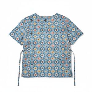 Women's Scrub Top by SB Scrubs, Size Medium, Blue with Colorful Flowers. Good Used Condition. ITEM #3382