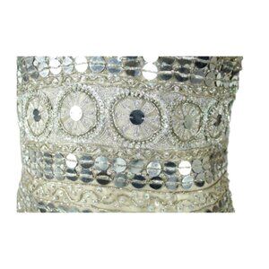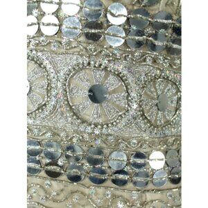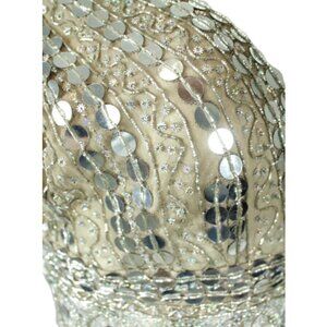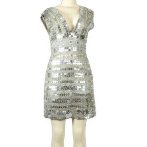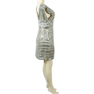 Scala couture sequin cocktail dress is made by hand has V neck on front and back, brown sheer underlay, tan lining with side zip closure.