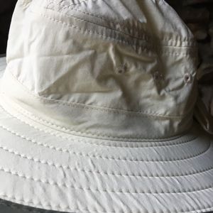 This Scala Boonie Hat has a wonderful bow to accent the look. It is one size and is adjustable using the bow. It is constructed of Coolmax Sweat resistant fabric, and it is water repellant, making it a wonderful rain hat as well. It is light and breathable and is floatable. The brim measures 3 1/4 inches, and the hat is constructed of Supplex Nylon. The hat is ivory with a khaki rim. It is new with tags.