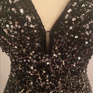 Sequined 100% silk black special occasion dress by SCALA! Slits up both sides! Sexy yet classy halter style. Black and silver sequined. STUNNING. 55-inches long built in breast cups! Back zipper and eye hooks. Double hooks behind neck( hooks are deep set in but they are both there) 17 inches pit to pit lying flat. Waistline is 14.5 inches lying flat hips 18.5 inches lying flat. Worn once perfect for any black tie affair or prom