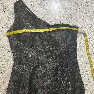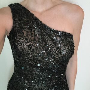 EUC SCALA black sequin silk side zip one shoulder cocktail mini dress with breast cups vintage size 12 fits like a modern 6 please see measurements